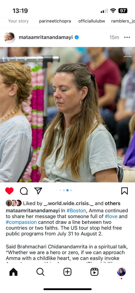 I often reflect upon the fact that, She actually knows that. The only problem here is that we don’t know it. This is one of the reasons Amma is always so relaxed. During Q&A in Darshan or the Question Line, you could be asking the most crucial of questions from your point of view, yet Amma is totally unfazed by it : perfectly relaxed, yet intimately engaged. She doesn’t need to distance Herself away from the suffering or the dilemma you are presenting and Her beautifully undisturbed manner melts even the most anxious of hearts. She knows exactly what you are, therefore She remains unruffled by your inner kicking and screaming – lol! My friends and I often walk away feeling something along the lines that, if Amma is not worried about this – am I really worried..?