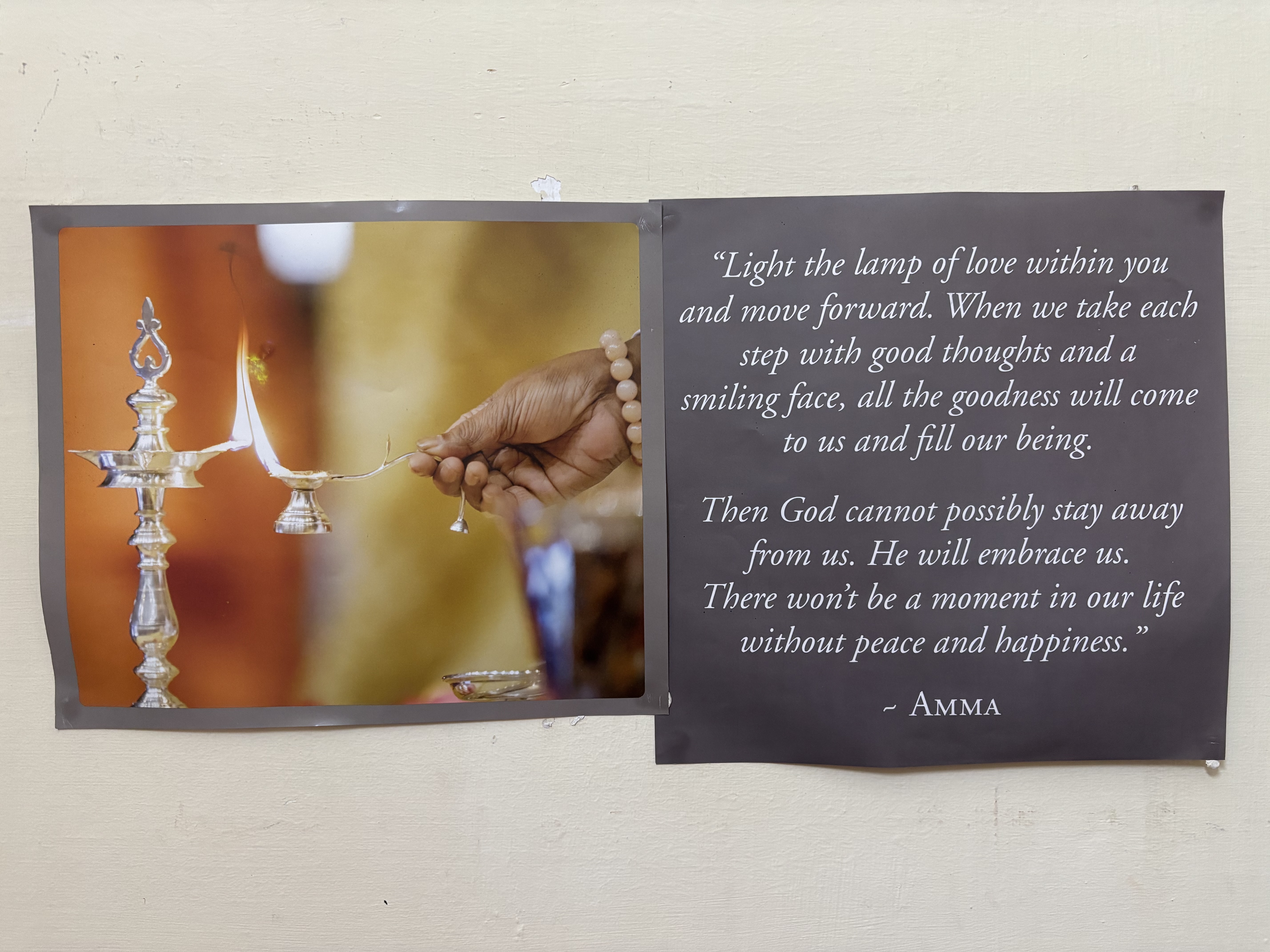 I was staying in a hotel in Trivandrum after I arrived in India. I had planned to go to Amritapuri on New Year’s Eve. The morning of the big day came and I sat to do my daily Archana (the 1000 Names of the Divine Mother). Suddenly, a love song began to run through my mind… I was gazing at Amma’s photo at the same time and I could see Her eyes brightening at me from the photo, shining and piercing with Light. Not figuratively, but literally. After a while of being with Amma, one understands these kinds of little miracles as natural phenomena. I felt so in love with Her…I began to cry from devotion. When I arrived at the ashram that evening, Amma was singing in the big hall. The first thing I saw were the lyrics to the bhajan, which read, “With the ink of my tears I write you a thousand love songs.” I was struck by the synchronicity. A passenger in Mumbai airport had previously asked me why I was going to see Amma. I replied that I wanted to learn about compassion and also to volunteer for what I see as the greatest charity the world has ever known. Yet standing there in that moment on New Year’s Eve, I realised that it was really out of love. Wouldn’t I want to go to the one I love..? Further beauty even arrived later on, in the form of my favourite bhajan, which was sung as the climax of the session. What a welcome… 🙂