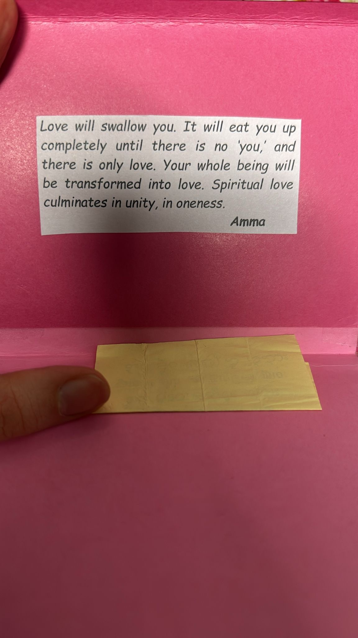 I remembered at that point, our journey together with Amma at the Los Angeles program this summer. I managed to get us onto the stage with Amma when Kitty entered the hall. We were seated at the back of the stage, yet Amma found Kitty’s eyes several times and gave her a deep gaze. For some reason, probably Grace, we were kept on the stage for more than an hour, which is unusual nowadays especially for a first-timer. When it came to Darshan, Amma spent a great deal of time with Kitty, playing like a child with the healing chocolate characters she has created, along with her amazing tarot cards and shoe designs – part of the collection for her brand ‘Again’, aka ‘Positive Energy Flows Again’. Amma then reached over and handed her an apple. That was when I really knew…something is going to come of this.